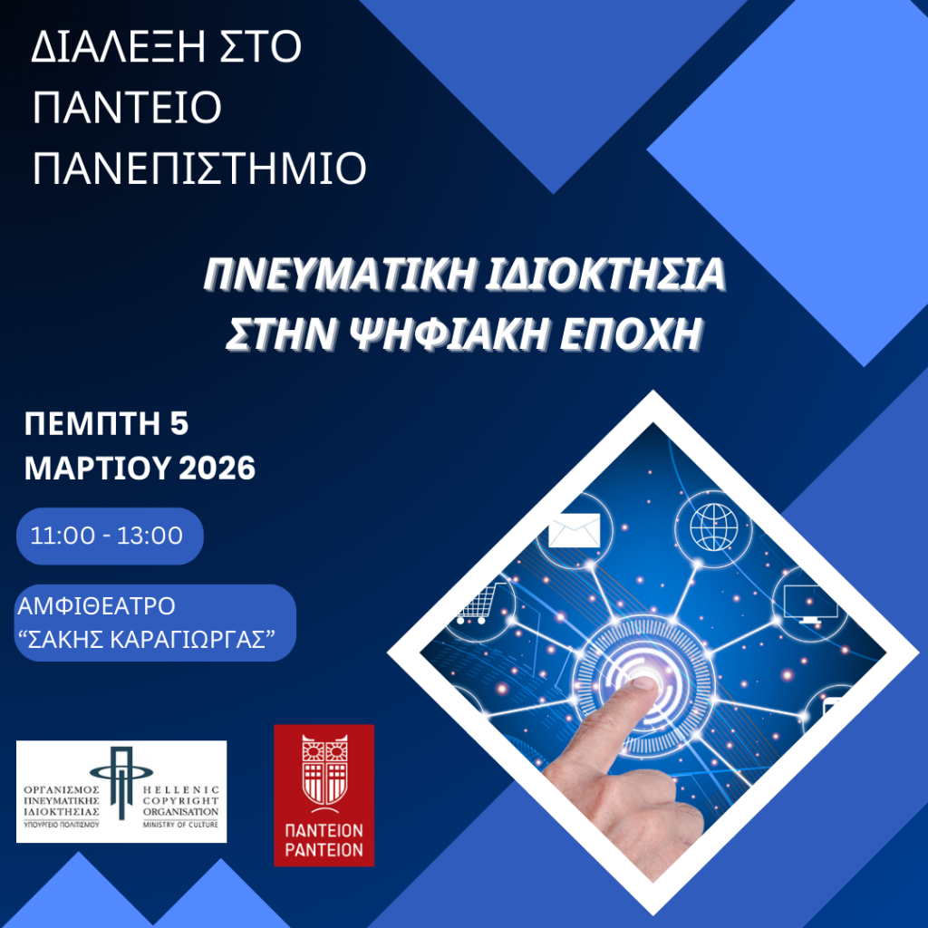Την Πέμπτη 5 Μαρτίου 2026, 11:00 – 13:00, στο Αμφιθέατρο «Σάκης Καράγιωργας» του Παντείου Πανεπιστημίου, θα πραγματοποιηθεί επιστημονική εκδήλωση με θέμα «Πνευματική Ιδιοκτησία στην Ψηφιακή Εποχή», στο πλαίσιο του Μνημονίου εκπαιδευτικής συνεργασίας μεταξύ του Παντείου Πανεπιστημίου και του Οργανισμού Πνευματικής Ιδιοκτησίας.