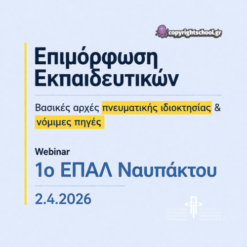 Την Πέμπτη 2 Απριλίου 2026, ο Οργανισμός Πνευματικής Ιδιοκτησίας (ΟΠΙ) πραγματοποίησε διαδικτυακό εκπαιδευτικό σεμινάριο σε συνεργασία με το 1ο ΕΠΑΛ Ναυπάκτου.